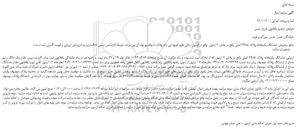 ارزیابی ششدانگ یکبابخانه پلاک 3685 اصلی واقع در بخش 2 اردبیل که از املاک ثبت شده بوده و سند مالکیت آن بشرح صفحات 1044/8413 دفاتر جلد 14 و 77 بنام ایوب و راضیه هر دو بنام خانوادگی باقلاچی ثبت صادر گردیده سپس مقدار یک دانگ و نیم مشاع از ششدانگ پلاک موصوف برابر سند شماره 96246-1348/03/07 دفترخانه 17 اردبیل از سوی راضیه باقلاچی بنام طاهره باقلاچی انتقال قطعی یافته همچنین برابر سند شماره 184647-1384/02/21دفترخانه 17 اردبیل اقای ایوب باقلاچی مقدار سه دانگ مشاع از ششدانگ پلاک موصوف را بنام خانم فریده بیرام نژاد که به شرط خیارفسخ مصالحه نموده بموجب گواهی حصر وراثت شماره 6409970494100753-1394/02/16 صادره از شعبه 11 شورای حل اختلاف اردبیل نامبرده اخیرالذکر فوت وراث حین الفوت عبارتند از:راضیه عاقل زاده و آرزو و حسن بنام خانوادگی باقلاچی میباشد محل وقوع ملک واقع در اردبیل عالی قاپو کوچه ابی زاده پلاک 8 بازدید و ضمن تطبیق حدود مندرج در سند مالکیت با موقعیت محل چنین مشاهده گردید در محدوده پلاک موصوف یکباب ساختمان باقدمت بالای 50 سال احداث گردیده دارای امتیازات آب،برق،گاز و... بوده که مساحت اعیانی حدود114/60متر مربع و عرصه بمساحت 291/54 متر مربع بوده که با در نظر گرفتن موقعیت محل و سایر جوانب موثر در کارشناسی ششدانگ پلاک موصوف بمبلغ 13/119/300/000 ریال ارزیابی میگردد.