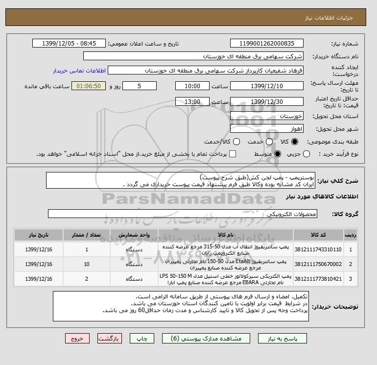 شرح کلی نیاز: بوسترپمپ - پمپ لجن کش(طبق شرح پیوست)
