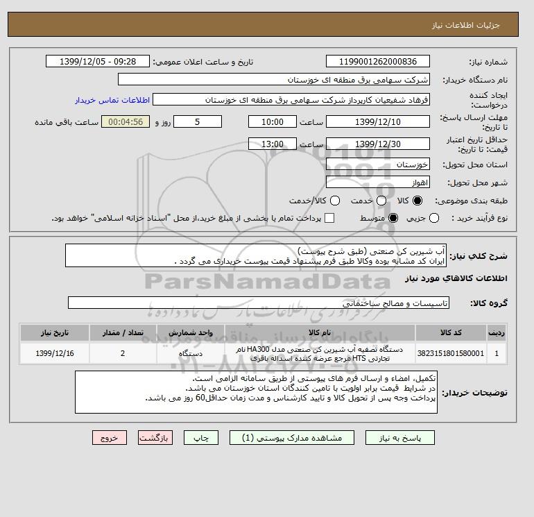 شرح کلی نیاز: آب شیرین کن صنعتی (طبق شرح پیوست)