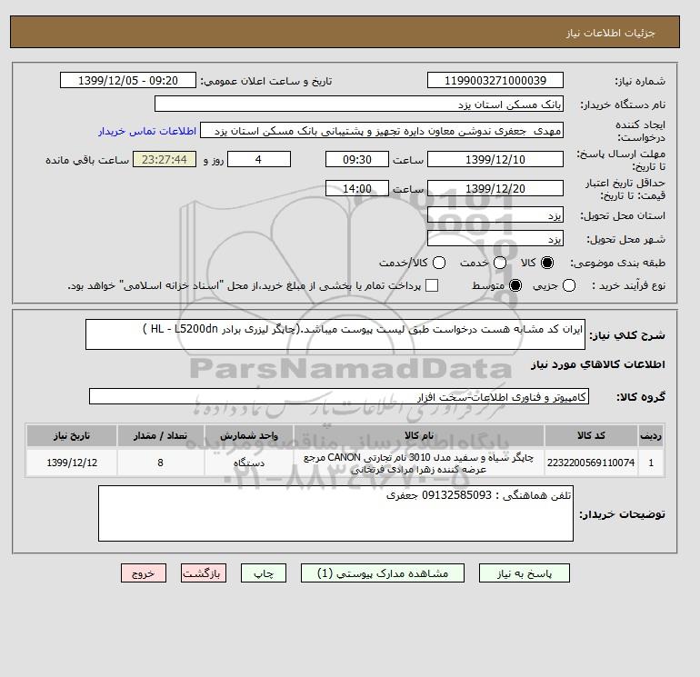 استعلام ایران کد مشابه هست درخواست طبق لیست پیوست میباشد.(چاپگر لیزری برادر HL - L5200dn ), استعلام ایران کد مشابه هست درخواست طبق لیست پیوست میباشد.(چاپگر لیزری برادر HL - L5200dn )