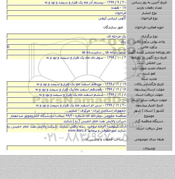 مناقصه, مناقصه عمومی دومرحله ای شماره ۹۹/۳۰ ساخت دودستگاه الکتروموتور ضدانفجار از کلیه افراد متخصص و شرکتها واجد شرایط دعوت به عمل میآید در مناقصه با کد خبرگزاری پارس نماد: 3208526 شرکت نمایند.