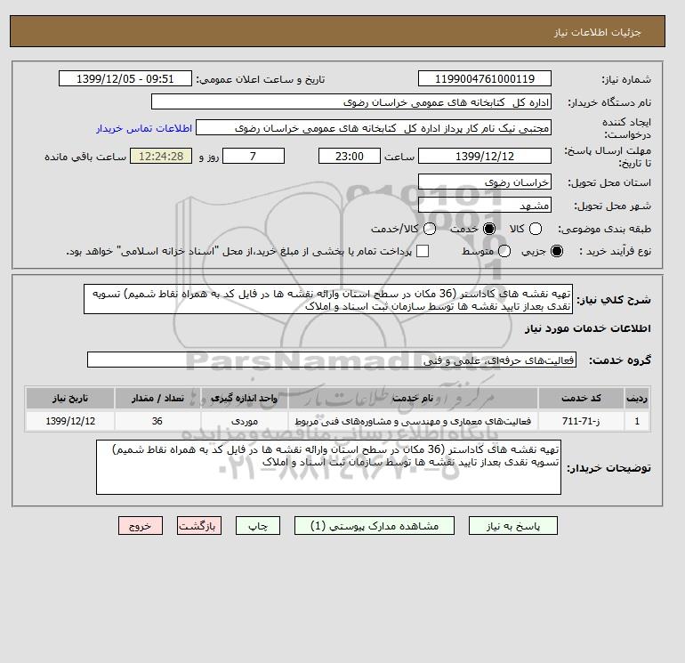 توضیحات خریدار:تهیه نقشه های کاداستر (36 مکان در سطح استان وارائه نقشه ها در فایل کد به همراه نقاط شمیم) تسویه نقدی بعداز تایید نقشه ها توسط سازمان ثبت اسناد و املاک