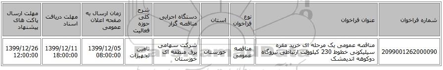 2099001262000090مناقصه عمومی یک مرحله ای خرید مقره سیلیکونی خطوط 230 کیلوولت ارتباطی نیروگاه دوکوهه اندیمشکمناقصه عمومیخوزستانشرکت سهامی برق منطقه ای خوزستانتامین تجهیزات1399/12/05 08:00:001399/12/11 18:00:001399/12/26 12:00:00