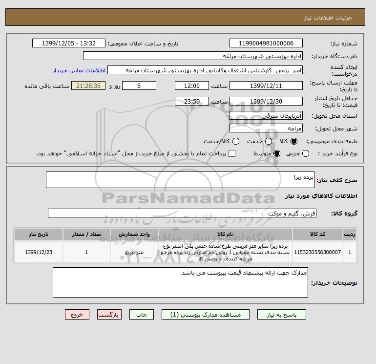| 1 | 1153230556300007 | پرده زبرا سایز متر مربعی طرح ساده جنس پلی استر نوع بسته بندی بسته مقوایی 1 رولی نام تجارتی راد پرده مرجع عرضه کننده راد پویش کار | متر مربع | 1 | 1399/12/23 |