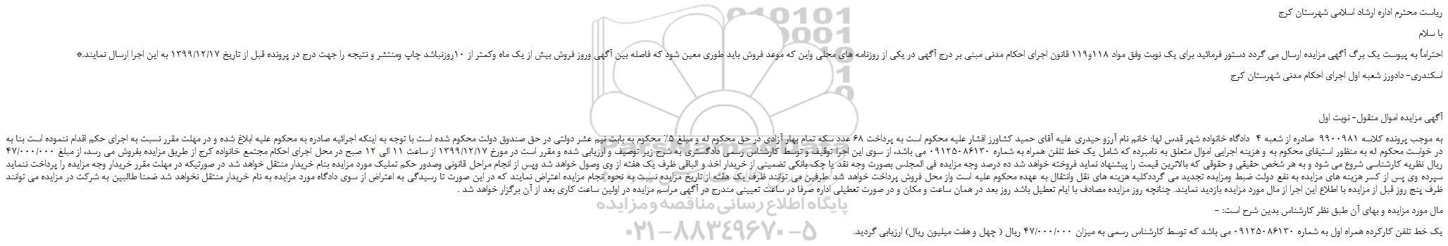 به موجب پرونده کلاسه 9900981 صادره از شعبه 4 دادگاه خانواده شهر قدس لها: خانم نام آرزو حیدری علیه آقای حمید کشاورز افشار علیه محکوم است به پرداخت 68 عدد سکه تمام بهار آزادی در حق محکوم له و مبلغ 5% محکوم به بابت نیم عشر دولتی در حق صندوق دولت محکوم شده است با توجه به اینکه اجرائیه صادره به محکوم علیه ابلاغ شده و در مهلت مقرر نسبت به اجرای حکم اقدام ننموده است بنا به در خواست محکوم له به منظور استیفای محکوم به و هزینه اجرایی اموال متعلق به نامبرده که شامل یک خط تلفن همراه به شماره 09125086130 می باشد، از سوی این اجرا توقیف و توسط کارشناس رسمی دادگستری به شرح زیر توصیف و ارزیابی شده و مقرر است در مورخ 1399/12/17 از ساعت 11 الی 12 صبح در محل اجرای احکام مجتمع خانواده کرج از طریق مزایده بفروش می رسد، از مبلغ 47/000/000 ریال نظریه کارشناسی شروع می شود و به هر شخص حقیقی و حقوقی که بالاترین قیمت را پیشنهاد نماید فروخته خواهد شد ده درصد وجه مزایده فی المجلس بصورت وجه نقد یا چک بانکی تضمینی از خریدار اخذ و الباقی ظرف یک هفته از وی وصول خواهد شد وپس از انجام مراحل قانونی وصدور حکم تملیک مورد مزایده بنام خریدار منتقل خواهد شد در صورتیکه در مهلت مقرر خریدار وجه مزایده را پرداخت ننماید سپرده وی پس از کسر هزینه های مزایده به نفع دولت ضبط ومزایده تجدید می گرددکلیه هزینه های نقل وانتقال به عهده محکوم علیه است واز محل فروش پرداخت خواهد شد .طرفین می توانند ظرف یک هفته از تاریخ مزایده نسبت به نحوه انجام مزایده اعتراض نمایند که در این صورت تا رسیدگی به اعتراض از سوی دادگاه مورد مزایده به نام خریدار منتقل نخواهد شد ضمنا طالبین به شرکت در مزایده می توانند ظرف پنج روز قبل از مزایده با اطلاع این اجرا از مال مورد مزایده بازدید نمایند. چنانچه روز مزایده مصادف با ایام تعطیل باشد روز بعد در همان ساعت و مکان و در صورت تعطیلی اداره صرفا در ساعت تعیینی مندرج در آگهی مراسم مزایده در اولین ساعت کاری بعد از آن برگزار خواهد شد .