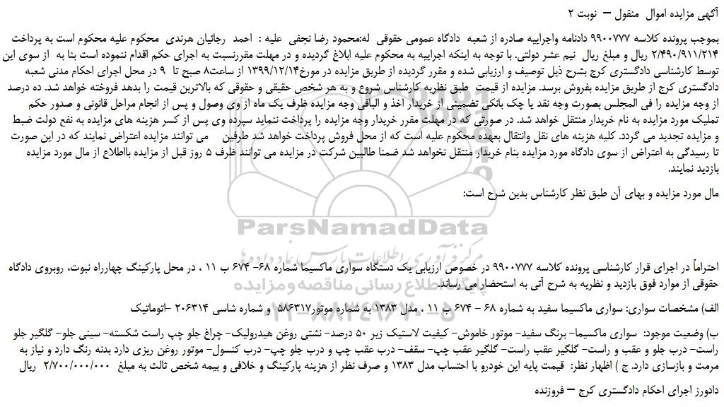 بموجب پرونده کلاسه 9900777 دادنامه واجراییه صادره از شعبه دادگاه عمومی حقوقی له:محمود رضا نجفی علیه : احمد رجائیان هرندی محکوم علیه محکوم است به پرداخت 2/490/911/214 ریال و مبلغ ریال نیم عشر دولتی. با توجه به اینکه اجراییه به محکوم علیه ابلاغ گردیده و در مهلت مقررنسبت به اجرای حکم اقدام ننموده است بنا به از سوی این اجرا توقیف توسط کارشناسی دادگستری کرج بشرح ذیل توصیف و ارزیابی شده و مقرر گردیده از طریق مزایده در مورخ1399/12/14 از ساعت8 صبح تا 9 در محل اجرای احکام مدنی شعبه دادگستری کرج از طریق مزایده بفروش برسد. مزایده از قیمت طبق نظریه کارشناس شروع و به هر شخص حقیقی و حقوقی که بالاترین قیمت را بدهد فروخته خواهد شد. ده درصد از وجه مزایده را فی المجلس بصورت وجه نقد یا چک بانکی تضمینی از خریدار اخذ و الباقی وجه مزایده ظرف یک ماه از وی وصول و پس از انجام مراحل قانونی و صدور حکم تملیک مورد مزایده به نام خریدار منتقل خواهد شد. در صورتی که در مهلت مقرر خریدار وجه مزایده را پرداخت ننماید سپرده وی پس از کسر هزینه های مزایده به نفع دولت ضبط و مزایده تجدید می گردد. کلیه هزینه های نقل وانتقال بعهده محکوم علیه است که از محل فروش پرداخت خواهد شد طرفین می توانند مزایده اعتراض نمایند که در این صورت تا رسیدگی به اعتراض از سوی دادگاه مورد مزایده بنام خریدار منتقل نخواهد شد ضمنا طالبین شرکت در مزایده می توانند ظرف 5 روز قبل از مزایده بااطلاع از مال مورد مزایده بازدید نمایند.