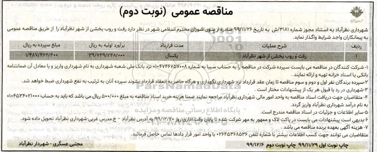 شهرداری نظرآباد در نظر دارد رفت و روب بخشی از شهر نظرآباد را از طریق مناقصه عمومی به پیمانکاران واجد شرایط واگذار نماید.