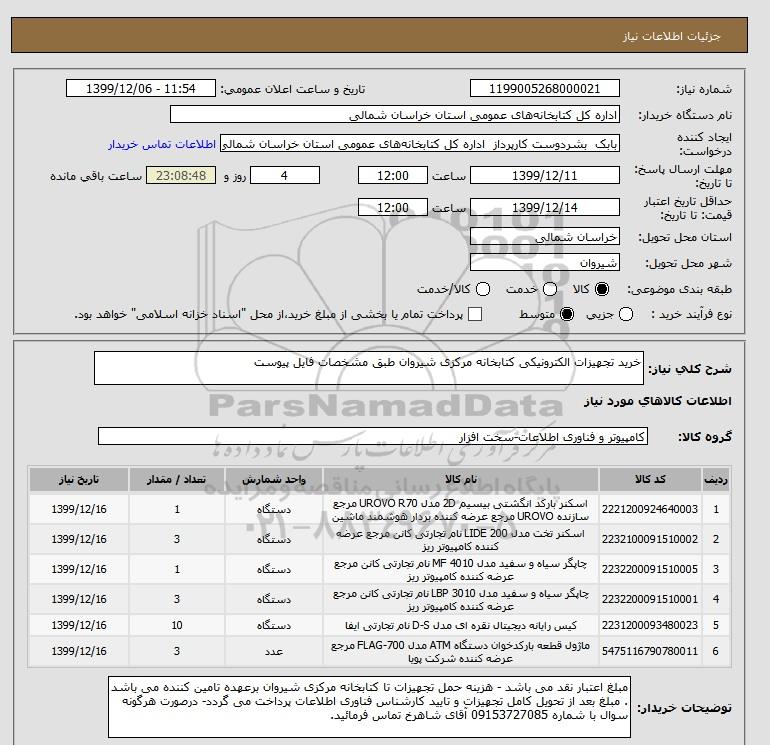 شرح کلی نیاز: خرید تجهیزات الکترونیکی کتابخانه مرکزی شیروان طبق مشخصات فایل پیوست