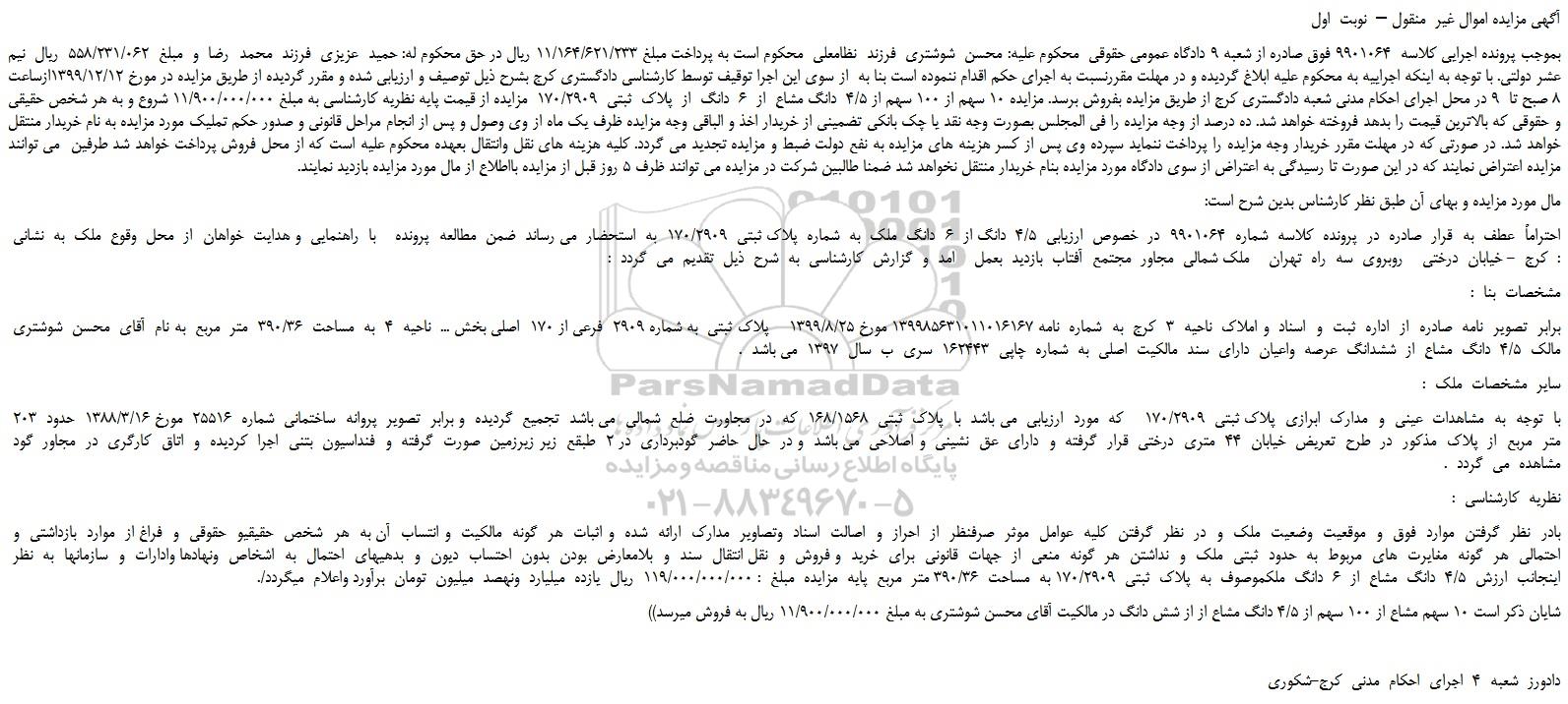 بموجب پرونده اجرایی کلاسه 9901064 فوق صادره از شعبه 9 دادگاه عمومی حقوقی محکوم علیه: محسن شوشتری فرزند نظامعلی محکوم است به پرداخت مبلغ 11/164/621/233 ریال در حق محکوم له: حمید عزیزی فرزند محمد رضا و مبلغ 558/231/062 ریال نیم عشر دولتی. با توجه به اینکه اجراییه به محکوم علیه ابلاغ گردیده و در مهلت مقررنسبت به اجرای حکم اقدام ننموده است بنا به از سوی این اجرا توقیف توسط کارشناسی دادگستری کرج بشرح ذیل توصیف و ارزیابی شده و مقرر گردیده از طریق مزایده در مورخ 1399/12/12ازساعت 8 صبح تا 9 در محل اجرای احکام مدنی شعبه دادگستری کرج از طریق مزایده بفروش برسد. مزایده 10 سهم از 100 سهم از 4/5 دانگ مشاع از 6 دانگ از پلاک ثبتی 170/2909 مزایده از قیمت پایه نظریه کارشناسی به مبلغ 11/900/000/000 شروع و به هر شخص حقیقی و حقوقی که بالاترین قیمت را بدهد فروخته خواهد شد. ده درصد از وجه مزایده را فی المجلس بصورت وجه نقد یا چک بانکی تضمینی از خریدار اخذ و الباقی وجه مزایده ظرف یک ماه از وی وصول و پس از انجام مراحل قانونی و صدور حکم تملیک مورد مزایده به نام خریدار منتقل خواهد شد. در صورتی که در مهلت مقرر خریدار وجه مزایده را پرداخت ننماید سپرده وی پس از کسر هزینه های مزایده به نفع دولت ضبط و مزایده تجدید می گردد. کلیه هزینه های نقل وانتقال بعهده محکوم علیه است که از محل فروش پرداخت خواهد شد طرفین می توانند مزایده اعتراض نمایند که در این صورت تا رسیدگی به اعتراض از سوی دادگاه مورد مزایده بنام خریدار منتقل نخواهد شد ضمنا طالبین شرکت در مزایده می توانند ظرف 5 روز قبل از مزایده بااطلاع از مال مورد مزایده بازدید نمایند.