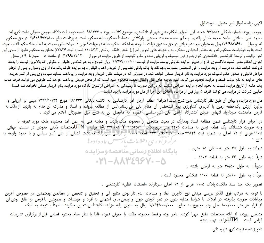 بموجب پرونده شماره بایگانی 972551 شعبه اول اجرای احکام مدنی شهریار دادگستری موضوع کلاسه پروند ه 981333 شعبه دوم نیابت دادگاه عمومی حقوقی نیابت کرج له: محمد تقی سعادتی علیه: محمد خلیلی پالندی و خانم سیده صدیقه حسینی ولوکلائی متضامناً محکوم علیه محکوم است به پرداخت مبلغ 2/619/673/800 در حق محکوم له و مبلغ 129/983/690ریال به عنوان نیم عشر دولتی در حق صندوق دولت. با توجه به اینکه محکوم علیه در مهلت قانونی در مهلت مقرر نسبت به انجام مفاد حکم اقدام ننموده است بنا به درخواست محکوم له و به منظور استیفای محکوم به و هزینه های اجرایی اموال( شش دانگ پ ثبتی 1105/12 شماره ثبت 33824) متعلق به محکوم علیها از سوی این اجرا توقیف و توسط کارشناسی دادگستری کرج بشرح ذیل توصیف و ارزیابی شده و مقرر گردیده از طریق مزایده در مورخ 20 /1399/12/ از ساعت 8 صبح تا 9 در محل اجرای احکام مدنی شعبه دادگستری کرج از طریق مزایده بفروش برسد. مزایده از قیمت1/764/000/000 ریال شروع و به هر شخص حقیقی و حقوقی که بالاترین قیمت را بدهد فروخته خواهد شد. ده درصد از وجه مزایده را فی المجلس بصورت وجه نقد یا چک بانکی تضمینی از خریدار اخذ و الباقی وجه مزایده ظرف یک ماه از وی وصول و پس از انجام مراحل قانونی و صدور حکم تملیک مورد مزایده به نام خریدار منتقل خواهد شد. در صورتی که در مهلت مقرر خریدار وجه مزایده را پرداخت ننماید سپرده وی پس از کسر هزینه های مزایده به نفع دولت ضبط و مزایده تجدید می گردد. کلیه هزینه های نقل وانتقال بعهده محکوم علیه است که از محل فروش پرداخت خواهد شد طرفین می توانند ظرف مدت یک هفته از تاریخ مزایده نسبت به نحوه انجام مزایده اعتراض نمایند که در این صورت تا رسیدگی به اعتراض از سوی دادگاه مورد مزایده بنام خریدار منتقل نخواهد شد ضمنا طالبین شرکت در مزایده می توانند ظرف 5 روز قبل از مزایده بااطلاع این اجرا از مال مورد مزایده بازدید نمایند.