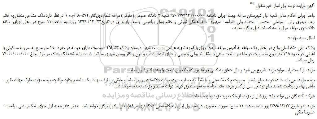 - مزایده در تاریخ 1399/12/23روز شنبه ساعت 11 صبح بصورت حضوری درشعبه اول اجرای احکام مدنی دادگستری مراغه(میدان مادر ) برگزار خواهد شد. مدیر دفتر شعبه اول اجرای احکام مدنی مراغه-علیرضا ملکی