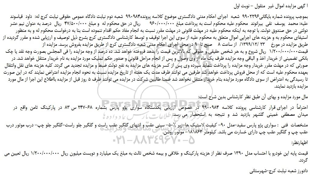 بموجب پرونده شماره بایگانی9902296 شعبه اجرای احکام مدنی دادگستری موضوع کلاسه پرونده990984 شعبه دوم نیابت دادگاه عمومی حقوقی نیابت کرج له: داود قیاسوند علیه: محمد یوسف نقی بیرانوند محکوم علیه محکوم است به پرداخت مبلغ 960/000/000 ریال در حق محکوم له و مبلغ 47/500/000 ریال درصد به عنوان نیم عشر دولتی در حق صندوق دولت. با توجه به اینکه محکوم علیه در مهلت قانونی در مهلت مقرر نسبت به انجام مفاد حکم اقدام ننموده است بنا به درخواست محکوم له و به منظور استیفای محکوم به و هزینه های اجرایی اموال متعلق به محکوم علیه از سوی این اجرا توقیف و توسط کارشناسی دادگستری کرج بشرح ذیل توصیف و ارزیابی شده و مقرر گردیده از طریق مزایده در مورخ 23 /1399/12/ از ساعت 8 صبح تا 9 در محل اجرای احکام مدنی شعبه دادگستری کرج از طریق مزایده بفروش برسد. مزایده از قیمت1/200/000/000 ریال شروع و به هر شخص حقیقی و حقوقی که بالاترین قیمت را بدهد فروخته خواهد شد. ده درصد از وجه مزایده را فی المجلس بصورت وجه نقد یا چک بانکی تضمینی از خریدار اخذ و الباقی وجه مزایده ظرف یک ماه از وی وصول و پس از انجام مراحل قانونی و صدور حکم تملیک مورد مزایده به نام خریدار منتقل خواهد شد. در صورتی که در مهلت مقرر خریدار وجه مزایده را پرداخت ننماید سپرده وی پس از کسر هزینه های مزایده به نفع دولت ضبط و مزایده تجدید می گردد. کلیه هزینه های نقل وانتقال بعهده محکوم علیه است که از محل فروش پرداخت خواهد شد طرفین می توانند ظرف مدت یک هفته از تاریخ مزایده نسبت به نحوه انجام مزایده اعتراض نمایند که در این صورت تا رسیدگی به اعتراض از سوی دادگاه مورد مزایده بنام خریدار منتقل نخواهد شد ضمنا طالبین شرکت در مزایده می توانند ظرف 5 روز قبل از مزایده بااطلاع این اجرا از مال مورد مزایده بازدید نمایند.