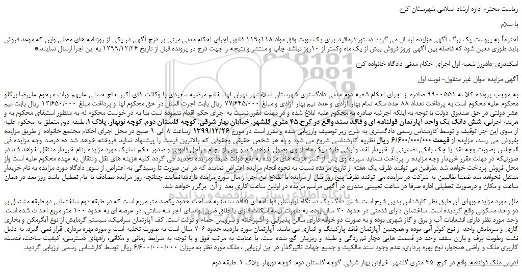 به موجب پرونده کلاسه 9900551 صادره از اجرای احکام شعبه دوم مدنی دادگستری شهرستان اسلامشهر تهران لها: خانم مرضیه سعیدی با وکالت اقای اکبر حاج حسنی علیهم وراث مرحوم علیرضا بیگلو محکوم علیه محکوم است به پرداخت تعداد 88 عدد سکه تمام بهار آزادی و عدد نیم بهار آزادی و مبلغ 77/645/000 ریال بابت اجرت المثل در حق محکوم لها و پرداخت مبلغ 13/650/000 ریال بابت نیم عشر دولتی در حق صندوق دولت با توجه به اینکه اجرائیه صادره به محکوم علیه ابلاغ شده و در مهلت مقرر نسبت به اجرای حکم اقدام ننموده است بنا به در خواست محکوم له به منظور استیفای محکوم به و هزینه اجرایی، شش دانگ یک واحد آپارتمان قولنامه ای و فاقد سند واقع در کرج.45 متری گلشهر. خیابان بهار شرقی. کوچه گلستان دوم. کوچه نوبهار. پلاک 1. طبقه دوم متعلق به محکوم علیه از سوی این اجرا توقیف و توسط کارشناس رسمی دادگستری به شرح زیر توصیف وارزیابی شده و مقرر است در مورخ 1399/12/26 ازساعت 8 الی 9 صبح در محل اجرای احکام مجتمع خانواده از طریق مزایده بفروش می رسد، مزایده از قیمت 6/600/000/000 ریال نظریه کارشناسی شروع می شود و به هر شخص حقیقی وحقوقی که بالاترین قیمت را پیشنهاد نماید فروخته خواهد شد ده درصد وجه مزایده فی المجلس بصورت وجه نقد یا چک بانکی تضمینی از خریدار اخذ والباقی ظرف یک ماه از وی وصول خواهد شد و پس از انجام مراحل قانونی و صدور حکم تملیک مورد مزایده بنام خریدار منتقل خواهد شد در صورتیکه در مهلت مقرر خریدار وجه مزایده را پرداخت ننماید سپرده وی پس از کسر هزینه های مزایده به نفع دولت ضبط ومزایده تجدید می گردد کلیه هزینه های نقل وانتقال به عهده محکوم علیه است واز محل فروش پرداخت خواهد شد .طرفین می توانند ظرف یک هفته از تاریخ مزایده نسبت به نحوه انجام مزایده اعتراض نمایند که در این صورت تا رسیدگی به اعتراض از سوی دادگاه مورد مزایده به نام خریدار منتقل نخواهد شد ضمنا طالبین به شرکت در مزایده می توانند ظرف پنج روز قبل از مزایده با اطلاع این اجرا از مال مورد مزایده بازدید نمایند چنانچه روز مزایده مصادف با ایام تعطیل باشد روز بعد در همان ساعت و مکان و درصورت تعطیلی اداره صرفا در ساعت تعیینی مندرج در آگهی مراسم مزایده در اولین ساعت کاری بعد از آن  برگزار خواهد شد.