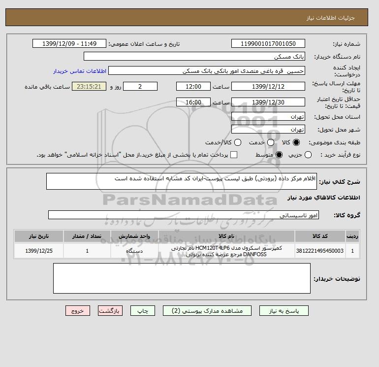 استعلام بها و موضوع استعلام استعلام اقلام مرکز داده (برودتی) طبق لیست پیوست-ایران کد مشابه استفاده شده است به اطلاع کلیه شرکتها و افراد متخصص واجد شرایط میرساند، آگهی گذار در نظر دارد از طریق استعلام بها، نسبت به انتخاب و دریافت پیشنهادات اقدام نماید. این استعلام با کد آگهی ثبت شده در سامانه خبرگزاری پارس نماد : 3220501 منتشر شده است. مشخصات استعلام : تاریخ شروع استعلام: 1399/12/09 آخرین مهلت ارسال پیشنهاد قیمت : 1399/12/11 و محل اجرای پروژه : استان تهران میباشد. استعلام قیمت مورد درخواست : استعلام اقلام مرکز داده (برودتی) طبق لیست پیوست-ایران کد مشابه استفاده شده است با دستهبندیهای تخصصی و گروه های مرتبط : تاسیسات ساختمانی, صنایع حرارتی و برودتی, سیستم تهویه و هواکشی صنعتی, کمپرسورهای هوا, استعلام اطلاع رسانی میگردد. شرایط شرکت در استعلام آنلاین : ابتدا ثبت نام در سامانه استعلام پارس نماد و تکمیل مدارک موردنیاز و بارگذاری در سامانه رعایت تمامی ضوابط و الزامات مندرج در اسناد استعلام است.