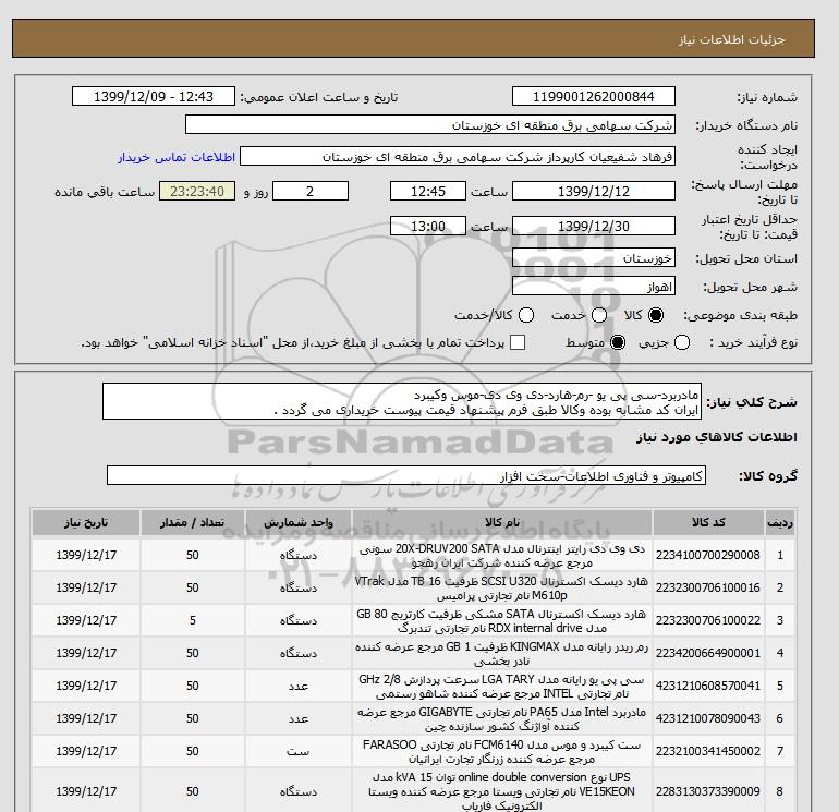 شرح کلی نیاز: مادربرد-سی پی یو -رم-هارد-دی وی دی-موس وکیبرد ایران کد مشابه بوده وکالا طبق فرم پیشنهاد قیمت پیوست خریداری می گردد .
