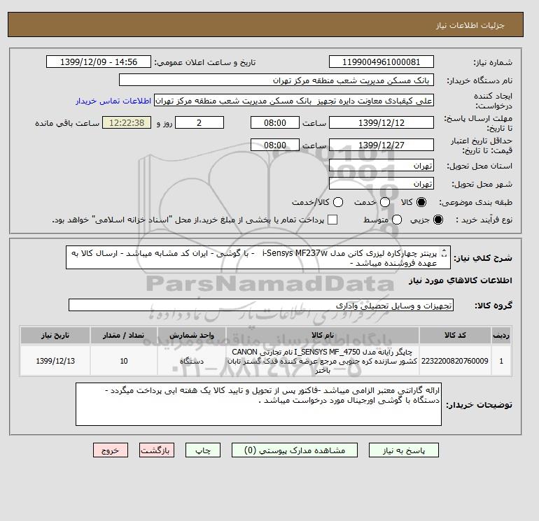 نام دستگاه خریدار: بانک مسکن مدیریت شعب منطقه مرکز تهران