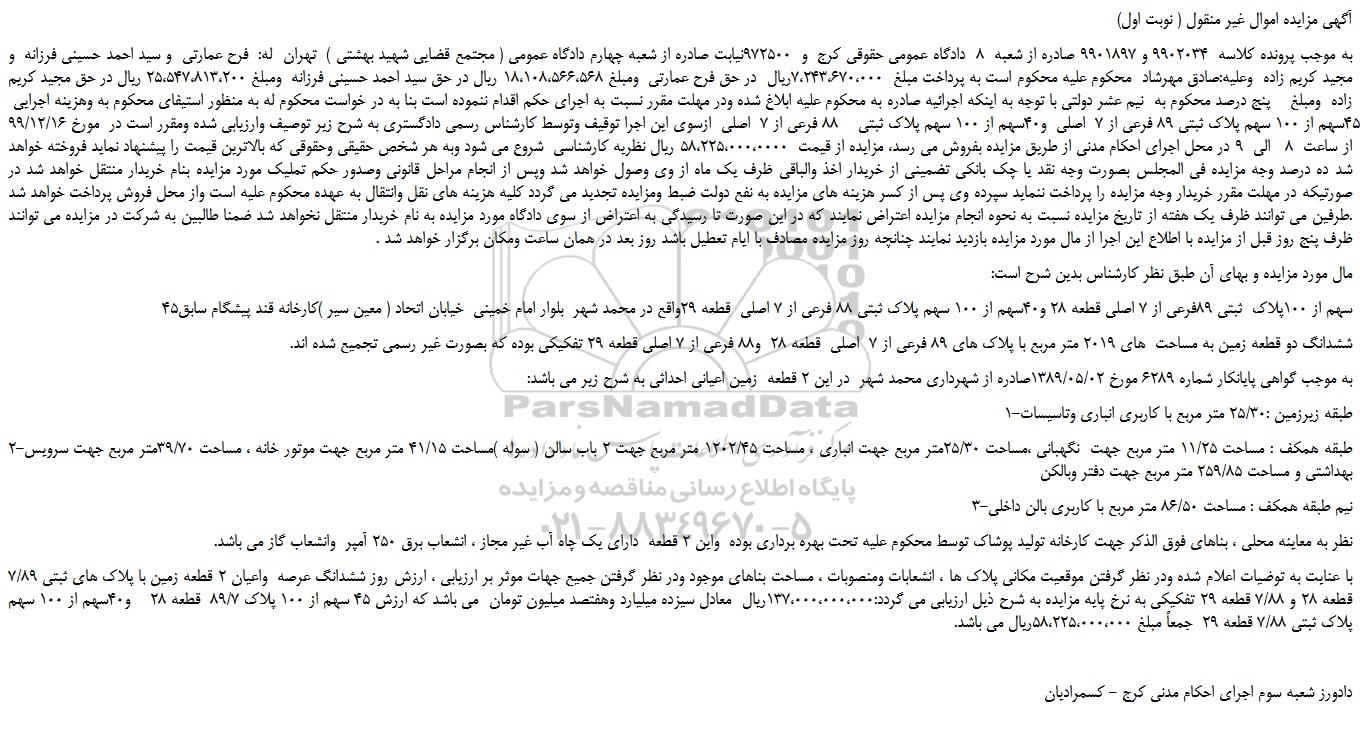 به موجب پرونده کلاسه 9902034 و 9901897 صادره از شعبه 8 دادگاه عمومی حقوقی کرج و 972500نیابت صادره از شعبه چهارم دادگاه عمومی ( مجتمع قضایی شهید بهشتی ) تهران له: فرح عمارتی و سید احمد حسینی فرزانه و مجید کریم زاده وعلیه:صادق مهرشاد محکوم علیه محکوم است به پرداخت مبلغ 7،243،670،000ریال در حق فرح عمارتی ومبلغ 18،108،566،568 ریال در حق سید احمد حسینی فرزانه ومبلغ 25،547،813،200 ریال در حق مجید کریم زاده ومبلغ پنج درصد محکوم به نیم عشر دولتی با توجه به اینکه اجرائیه صادره به محکوم علیه ابلاغ شده ودر مهلت مقرر نسبت به اجرای حکم اقدام ننموده است بنا به در خواست محکوم له به منظور استیفای محکوم به وهزینه اجرایی 45سهم از 100 سهم پلاک ثبتی 89 فرعی از 7 اصلی و40سهم از 100 سهم پلاک ثبتی 88 فرعی از 7 اصلی ازسوی این اجرا توقیف وتوسط کارشناس رسمی دادگستری به شرح زیر توصیف وارزیابی شده ومقرر است در مورخ 99/12/16 از ساعت 8 الی 9 در محل اجرای احکام مدنی از طریق مزایده بفروش می رسد، مزایده از قیمت 58،225،000،0000 ریال نظریه کارشناسی شروع می شود وبه هر شخص حقیقی وحقوقی که بالاترین قیمت را پیشنهاد نماید فروخته خواهد شد ده درصد وجه مزایده فی المجلس بصورت وجه نقد یا چک بانکی تضمینی از خریدار اخذ والباقی ظرف یک ماه از وی وصول خواهد شد وپس از انجام مراحل قانونی وصدور حکم تملیک مورد مزایده بنام خریدار منتقل خواهد شد در صورتیکه در مهلت مقرر خریدار وجه مزایده را پرداخت ننماید سپرده وی پس از کسر هزینه های مزایده به نفع دولت ضبط ومزایده تجدید می گردد کلیه هزینه های نقل وانتقال به عهده محکوم علیه است واز محل فروش پرداخت خواهد شد .طرفین می توانند ظرف یک هفته از تاریخ مزایده نسبت به نحوه انجام مزایده اعتراض نمایند که در این صورت تا رسیدگی به اعتراض از سوی دادگاه مورد مزایده به نام خریدار منتقل نخواهد شد ضمنا طالبین به شرکت در مزایده می توانند ظرف پنج روز قبل از مزایده با اطلاع این اجرا از مال مورد مزایده بازدید نمایند چنانچه روز مزایده مصادف با ایام تعطیل باشد روز بعد در همان ساعت ومکان برگزار خواهد شد .