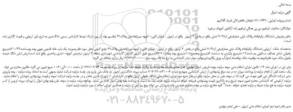 بنابر این در اجرای ماده 114 قانون اجرای احکام مدنی موعد مزایده جهت فروش اموال توقیفی که با حضور نماینده محترم دادسرا برگزار خواهد شد ، مزایده در روز شنبه مورخه 1399/12/23 از ساعت 10:00الی10:30 صبح تعیین می گردد. طالبین محترم می تواند یک ساعت قبل از انجام مزایده با پرداخت میزان ده در صد مبلغ پشنهادی از ارزش کارشناسی معینه به شماره 2171290841006 حساب سپرده دادگستری اردبیل نزد بانک ملی واریز ودر جلسه مزایده شرکت نمایند .بدیهی است به استثناء برنده مزایده ، وجه واریزی سایر شرکت کنندگان فی الفور عودت می گردد لذا در موعد مقرر در محل مزایده واقع در دفتر شعبه دوم اجرای احکام مدنی دادگاه حقوقی اردبیل واقع در کارشناسان – شهرک اداری حاضر و در جلسه مزایده شرکت نموده و قیمت پیشنهادی خودشان را اعلام نمایند . مزایده از قیمتی که کارشناس محترم تعیین نموده شروع و به بالاترین قیمت پیشنهادی فروخته خواهد شد.برنده مزایده ظرف یک ماه نسبت به پرداخت بقیه بهای اموال اقدام می نماید . چنانچه برنده مزایده در موعد مقرر بقیه بهای اموال را نپردازد سپرده او پس از کسر هزینه مزایده به نفع دولت ضبط و مزایده تجدید خواهد . ضمنا" کلیه مخارج مزایده بر عهده محکوم علیه می باشد.خریداران می توانند پنج روز قبل از مزایده با همکاری اجرای احکام از مورد مزادیده بازدید نمایند.