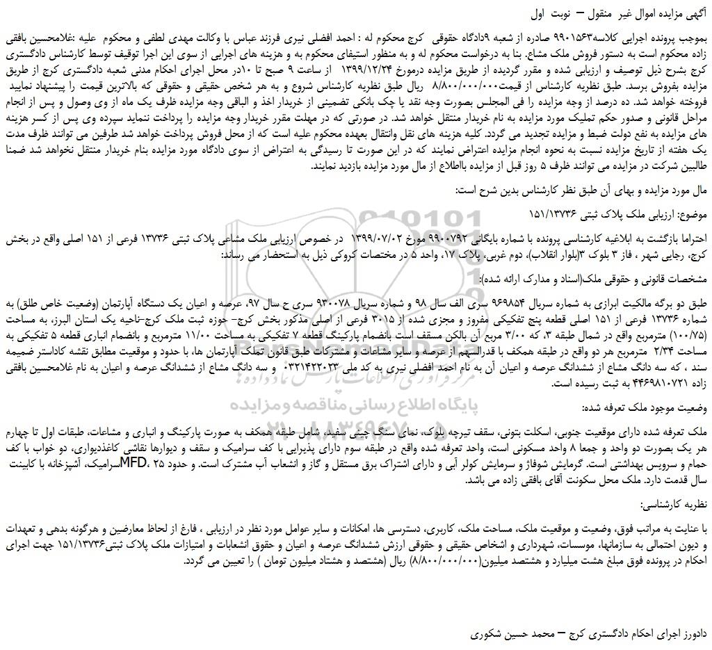 بموجب پرونده اجرایی کلاسه9901563 صادره از شعبه 9دادگاه حقوقی کرج محکوم له : احمد افضلی نیری فرزند عباس با وکالت مهدی لطفی و محکوم علیه :غلامحسین بافقی زاده محکوم است به دستور فروش ملک مشاع. بنا به درخواست محکوم له و به منظور استیفای محکوم به و هزینه های اجرایی از سوی این اجرا توقیف توسط کارشناس دادگستری کرج بشرح ذیل توصیف و ارزیابی شده و مقرر گردیده از طریق مزایده درمورخ 1399/12/24 از ساعت 9 صبح تا 10در محل اجرای احکام مدنی شعبه دادگستری کرج از طریق مزایده بفروش برسد. طبق نظریه کارشناس از قیمت8/800/000/000 ریال طبق نظریه کارشناس شروع و به هر شخص حقیقی و حقوقی که بالاترین قیمت را پیشنهاد نمایید فروخته خواهد شد. ده درصد از وجه مزایده را فی المجلس بصورت وجه نقد یا چک بانکی تضمینی از خریدار اخذ و الباقی وجه مزایده ظرف یک ماه از وی وصول و پس از انجام مراحل قانونی و صدور حکم تملیک مورد مزایده به نام خریدار منتقل خواهد شد. در صورتی که در مهلت مقرر خریدار وجه مزایده را پرداخت ننماید سپرده وی پس از کسر هزینه های مزایده به نفع دولت ضبط و مزایده تجدید می گردد. کلیه هزینه های نقل وانتقال بعهده محکوم علیه است که از محل فروش پرداخت خواهد شد طرفین می توانند ظرف مدت یک هفته از تاریخ مزایده نسبت به نحوه انجام مزایده اعتراض نمایند که در این صورت تا رسیدگی به اعتراض از سوی دادگاه مورد مزایده بنام خریدار منتقل نخواهد شد ضمنا طالبین شرکت در مزایده می توانند ظرف 5 روز قبل از مزایده بااطلاع از مال مورد مزایده بازدید نمایند.