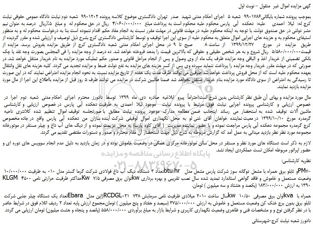 بموجب پرونده شماره بایگانی9901786 شعبه 5 اجرای احکام مدنی شهید صدر تهران دادگستری موضوع کلاسه پرونده 9901202 شعبه دوم نیابت دادگاه عمومی حقوقی نیابت کرج له: لیلا احمدی علیه: دهکده آبی پارس محکوم علیه محکوم است به پرداخت مبلغ 4/060/000/000 ریال در حق محکوم له و مبلغ 5%ریال درصد به عنوان نیم عشر دولتی در حق صندوق دولت. با توجه به اینکه محکوم علیه در مهلت قانونی در مهلت مقرر نسبت به انجام مفاد حکم اقدام ننموده است بنا به درخواست محکوم له و به منظور استیفای محکوم به و هزینه های اجرایی اموال متعلق به محکوم علیه از سوی این اجرا توقیف و توسط کارشناسی دادگستری کرج بشرح ذیل توصیف و ارزیابی شده و مقرر گردیده از طریق مزایده در مورخ 1399/12/27 از ساعت 8 صبح تا 9 در محل اجرای احکام مدنی شعبه دادگستری کرج از طریق مزایده بفروش برسد. مزایده از قیمت5/580/000/000 ریال شروع و به هر شخص حقیقی و حقوقی که بالاترین قیمت را بدهد فروخته خواهد شد. ده درصد از وجه مزایده را فی المجلس بصورت وجه نقد یا چک بانکی تضمینی از خریدار اخذ و الباقی وجه مزایده ظرف یک ماه از وی وصول و پس از انجام مراحل قانونی و صدور حکم تملیک مورد مزایده به نام خریدار منتقل خواهد شد. در صورتی که در مهلت مقرر خریدار وجه مزایده را پرداخت ننماید سپرده وی پس از کسر هزینه های مزایده به نفع دولت ضبط و مزایده تجدید می گردد. کلیه هزینه های نقل وانتقال بعهده محکوم علیه است که از محل فروش پرداخت خواهد شد طرفین می توانند ظرف مدت یک هفته از تاریخ مزایده نسبت به نحوه انجام مزایده اعتراض نمایند که در این صورت تا رسیدگی به اعتراض از سوی دادگاه مورد مزایده بنام خریدار منتقل نخواهد شد ضمنا طالبین شرکت در مزایده می توانند ظرف 5 روز قبل از مزایده بااطلاع این اجرا از مال مورد مزایده بازدید نمایند.