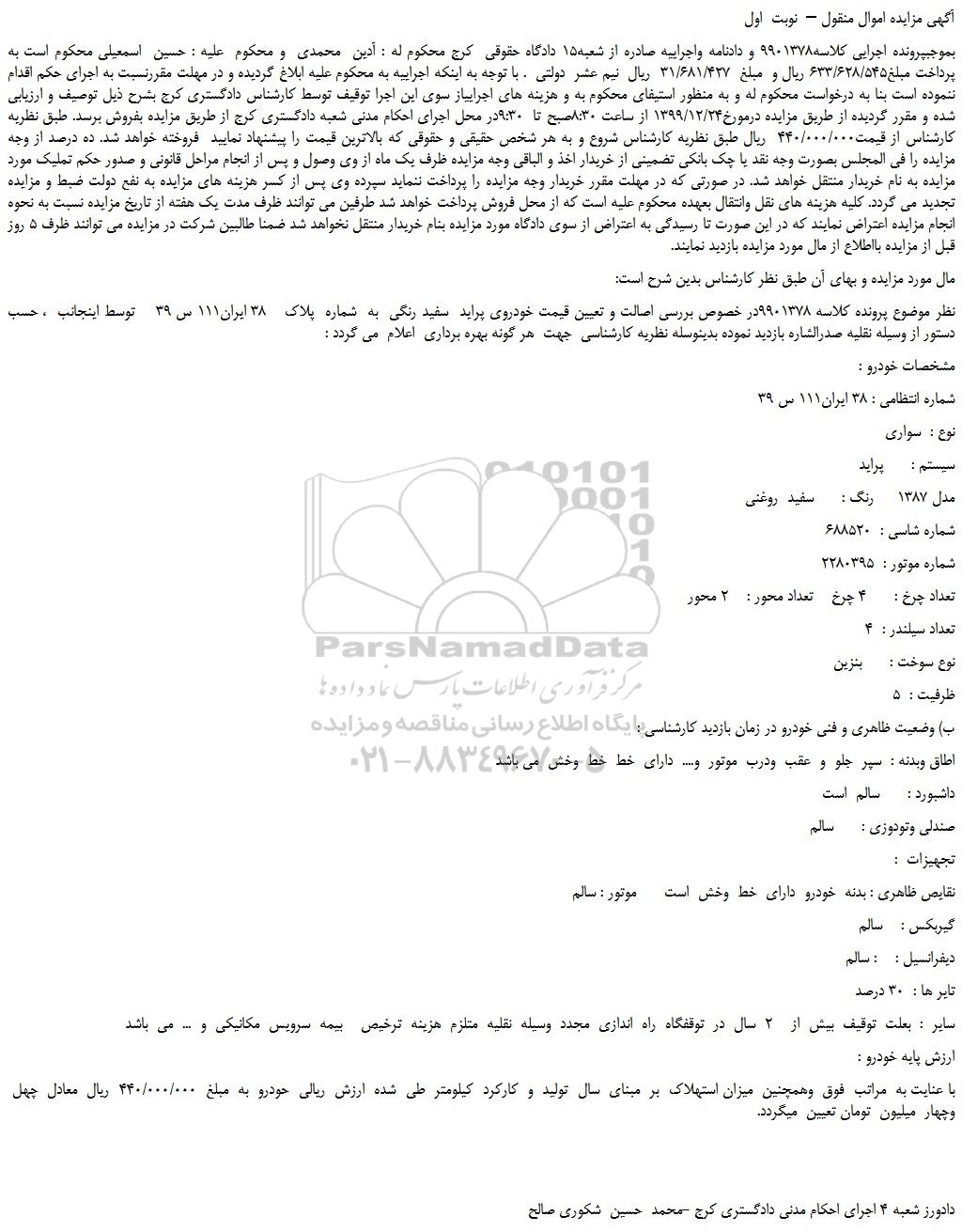 بموجبپرونده اجرایی کلاسه9901378 و دادنامه واجراییه صادره از شعبه15 دادگاه حقوقی کرج محکوم له : آدین محمدی و محکوم علیه : حسین اسمعیلی محکوم است به پرداخت مبلغ633/628/545 ریال و مبلغ 31/681/427 ریال نیم عشر دولتی . با توجه به اینکه اجراییه به محکوم علیه ابلاغ گردیده و در مهلت مقررنسبت به اجرای حکم اقدام ننموده است بنا به درخواست محکوم له و به منظور استیفای محکوم به و هزینه های اجراییاز سوی این اجرا توقیف توسط کارشناس دادگستری کرج بشرح ذیل توصیف و ارزیابی شده و مقرر گردیده از طریق مزایده درمورخ1399/12/24 از ساعت 8:30صبح تا 9:30در محل اجرای احکام مدنی شعبه دادگستری کرج از طریق مزایده بفروش برسد. طبق نظریه کارشناس از قیمت440/000/000 ریال طبق نظریه کارشناس شروع و به هر شخص حقیقی و حقوقی که بالاترین قیمت را پیشنهاد نمایید فروخته خواهد شد. ده درصد از وجه مزایده را فی المجلس بصورت وجه نقد یا چک بانکی تضمینی از خریدار اخذ و الباقی وجه مزایده ظرف یک ماه از وی وصول و پس از انجام مراحل قانونی و صدور حکم تملیک مورد مزایده به نام خریدار منتقل خواهد شد. در صورتی که در مهلت مقرر خریدار وجه مزایده را پرداخت ننماید سپرده وی پس از کسر هزینه های مزایده به نفع دولت ضبط و مزایده تجدید می گردد. کلیه هزینه های نقل وانتقال بعهده محکوم علیه است که از محل فروش پرداخت خواهد شد طرفین می توانند ظرف مدت یک هفته از تاریخ مزایده نسبت به نحوه انجام مزایده اعتراض نمایند که در این صورت تا رسیدگی به اعتراض از سوی دادگاه مورد مزایده بنام خریدار منتقل نخواهد شد ضمنا طالبین شرکت در مزایده می توانند ظرف 5 روز قبل از مزایده بااطلاع از مال مورد مزایده بازدید نمایند.