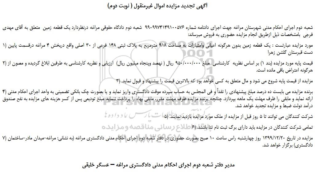 شعبه دوم اجرای احکام مدنی شهرستان مراغه جهت اجرای دادنامه شماره 9909974149100576 شعبه دوم دادگاه حقوقی مراغه درنظردارد یک قطعه زمین متعلق به آقای مهدی فرجی بامشخصات ذیل ازطریق انجام مزایده حضوری به فروش میرساند: