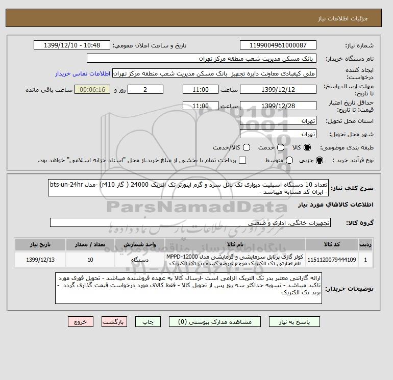 شرح کلی نیاز: تعداد 10 دستگاه اسپلیت دیواری تک پانل سرد و گرم اینورتر تک التریک 24000 ( گاز r410) -مدل bts-un-24hr - ایران کد مشابه میباشد -