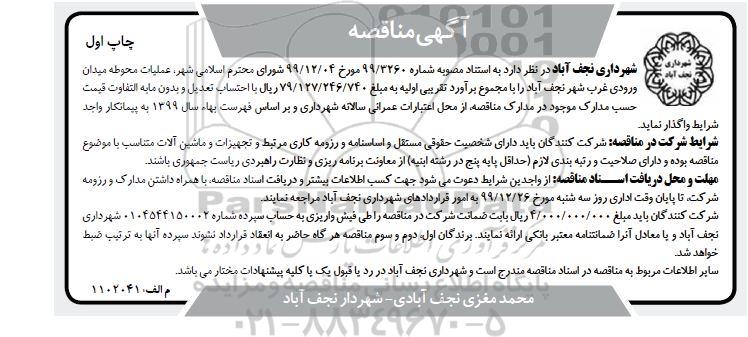 شهرداری نجف آباد در نظر دارد به استناد مصوبه شماره 3260/ 99 مورخ 99.12.4 شورای محترم اسلامی شهر، عملیات محوطه میدان ورودی غرب شهر نجف آباد را با مجموع برآورد تقریبی اولیه به مبلغ 79.127.246.740 ریال با احتساب تعدیل و بدون مابه التفاوت قیمت حسب مدارک موجود در مدارک مناقصه از محل ا اعتبارات عمرانی سالانه شهرداری و بر اساس فهرست بها سال ۹۹ به پیمانکار واجد شرایط واگذار نماید