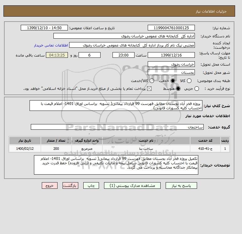شرح کلی نیاز: پروژه فخر آباد بجستان مطابق فهرست 99 قرارداد پیمانی( تسویه براساس اوراق 1401- اعلام قیمت با احتساب کلیه کسورات قانونی)