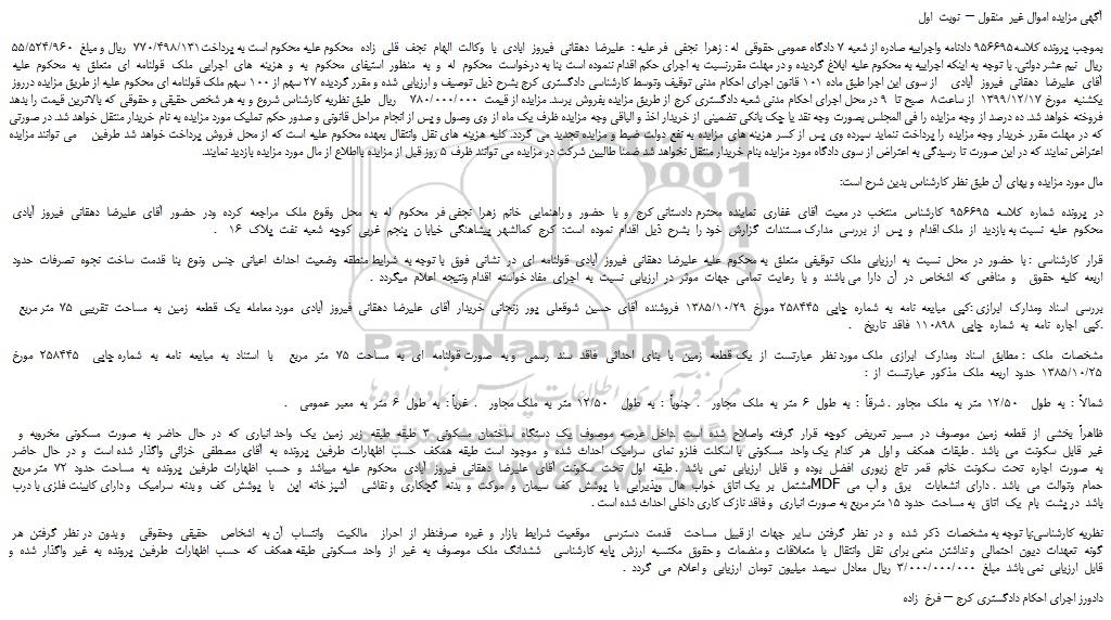 بموجب پرونده کلاسه956695 دادنامه واجراییه صادره از شعبه 7 دادگاه عمومی حقوقی له : زهرا نجفی فر علیه : علیرضا دهقانی فیروز ابادی با وکالت الهام نجف قلی زاده محکوم علیه محکوم است به پرداخت770/498/131 ریال و مبلغ 55/524/960 ریال نیم عشر دولتی. با توجه به اینکه اجراییه به محکوم علیه ابلاغ گردیده و در مهلت مقررنسبت به اجرای حکم اقدام ننموده است بنا به درخواست محکوم له و به منظور استیفای محکوم به و هزینه های اجرایی ملک قولنامه ای متعلق به محکوم علیه آقای علیرضا دهقانی فیروز آبادی از سوی این اجرا طبق ماده 101 قانون اجرای احکام مدنی توقیف وتوسط کارشناسی دادگستری کرج بشرح ذیل توصیف و ارزیابی شده و مقرر گردیده 27 سهم از 100 سهم ملک قولنامه ای محکوم علیه از طریق مزایده درروز یکشنبه مورخ 1399/12/17 از ساعت8 صبح تا 9 در محل اجرای احکام مدنی شعبه دادگستری کرج از طریق مزایده بفروش برسد. مزایده از قیمت 780/000/000 ریال طبق نظریه کارشناس شروع و به هر شخص حقیقی و حقوقی که بالاترین قیمت را بدهد فروخته خواهد شد. ده درصد از وجه مزایده را فی المجلس بصورت وجه نقد یا چک بانکی تضمینی از خریدار اخذ و الباقی وجه مزایده ظرف یک ماه از وی وصول و پس از انجام مراحل قانونی و صدور حکم تملیک مورد مزایده به نام خریدار منتقل خواهد شد. در صورتی که در مهلت مقرر خریدار وجه مزایده را پرداخت ننماید سپرده وی پس از کسر هزینه های مزایده به نفع دولت ضبط و مزایده تجدید می گردد. کلیه هزینه های نقل وانتقال بعهده محکوم علیه است که از محل فروش پرداخت خواهد شد طرفین می توانند مزایده اعتراض نمایند که در این صورت تا رسیدگی به اعتراض از سوی دادگاه مورد مزایده بنام خریدار منتقل نخواهد شد ضمنا طالبین شرکت در مزایده می توانند ظرف 5 روز قبل از مزایده بااطلاع از مال مورد مزایده بازدید نمایند.
