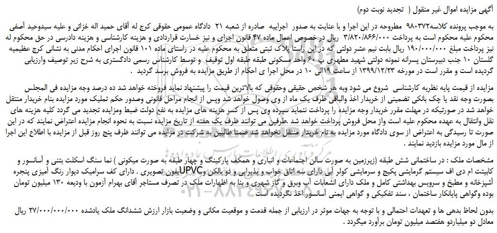 به موجب پرونده کلاسه980372 مطروحه در این اجرا و با عنایت به صدور اجراییه صادره از شعبه 21 دادگاه عمومی حقوقی کرج له آقای حمید اله خزائی و علیه سیدوحید آصفی محکوم علیه محکوم است به پرداخت 3/820/866/000 ریال در خصوص اعمال ماده 47 قانون اجرای و نیز خسارت قراردادی و هزینه کارشناسی و هزینه دادرسی در حق محکوم له نیز پرداخت مبلغ 190/000/000 ریال بابت نیم عشر دولتی که در این راستا پلاک ثبتی متعلق به محکوم علیه در راستای ماده 101 قانون اجرای احکام مدنی به نشانی کرج عظیمیه گلستان 10 جنب دبیرستان پسرانه نمونه دولتی شهید مطهری پ 60 واحد مسکونی طبقه طبقه اول توقیف و توسط کارشناس رسمی دادگستری به شرح زیر توصیف وارزیابی گردیده است و مقرر است در مورخه 1399/12/23 از ساعت 19الی 10 در محل اجرا ی احکام از طریق مزایده به فروش برسد گردید .