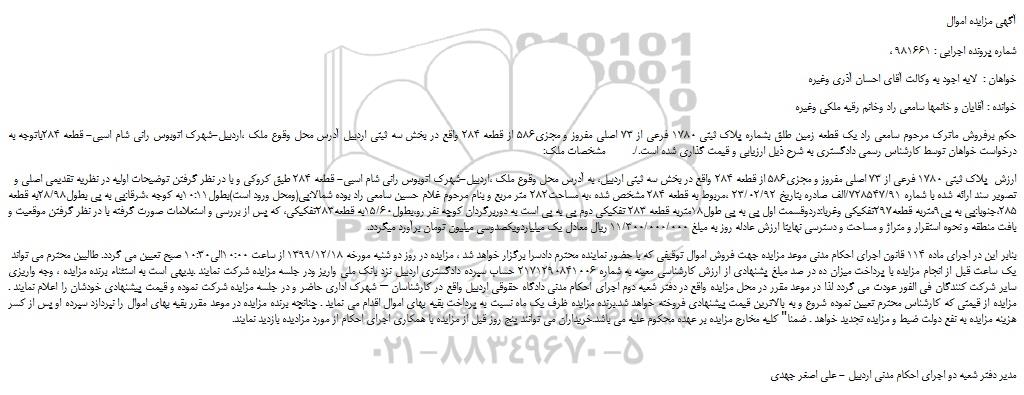 مزایده فروش یک قطعه زمین طلق بشماره پلاک ثبتی 1780 فرعی از 73 اصلی مفروز و مجزی586 از قطعه 284, مزایده،مزایده فروش یک قطعه زمین طلق بشماره پلاک ثبتی 1780 فرعی از 73 اصلی مفروز و مجزی586 از قطعه 284