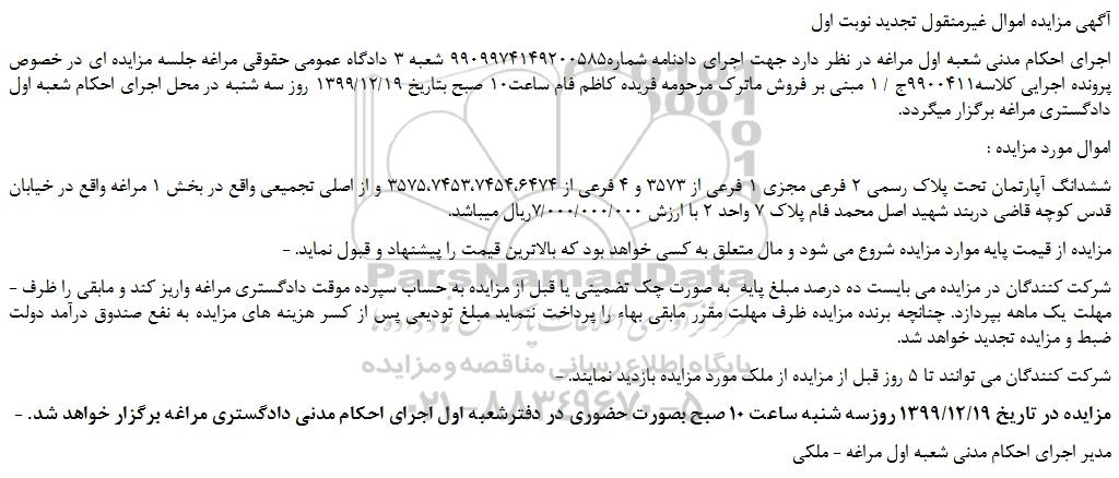 اجرای احکام مدنی شعبه اول مراغه در نظر دارد جهت اجرای دادنامه شماره9909974149200585 شعبه 3 دادگاه عمومی حقوقی مراغه جلسه مزایده ای در خصوص پرونده اجرایی کلاسه9900411ج / 1 مبنی بر فروش ماترک مرحومه فریده کاظم فام ساعت10 صبح بتاریخ 1399/12/19 روز سه شنبه در محل اجرای احکام شعبه اول دادگستری مراغه برگزار میگردد.