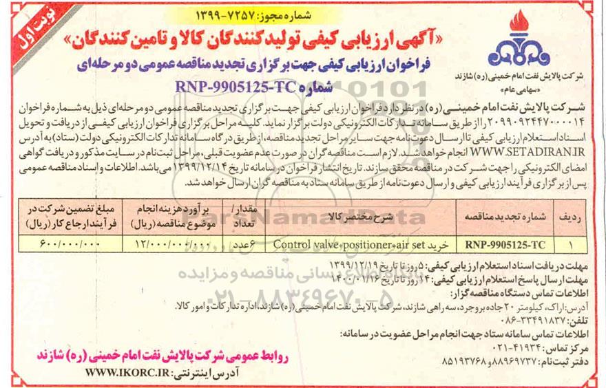 تجدید مناقصه CONTROL VALVE+POSITIONER+AIR SET از کلیه افراد متخصص و شرکتها واجد شرایط دعوت به عمل میآید در مناقصه با کد خبرگزاری پارس نماد: 3228916 شرکت نمایند.