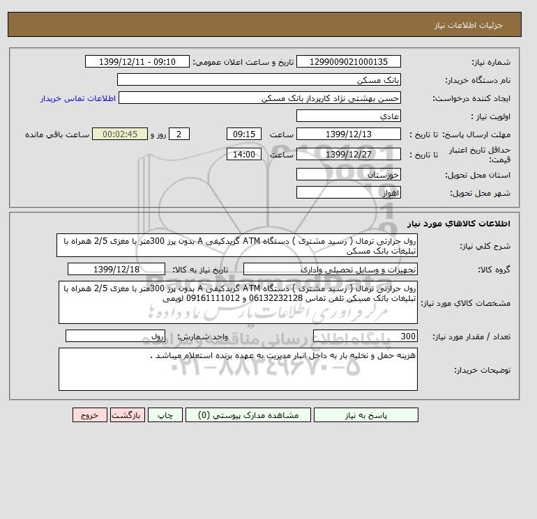 مشخصات کالای مورد نیاز: رول حرارتی ترمال ( رسید مشتری ) دستگاه ATM گریدکیفی A بدون پرز 300متر با مغزی 2/5 همراه با تبلیغات بانک مسکن تلفن تماس 06132232128 و 09161111012 لویمی