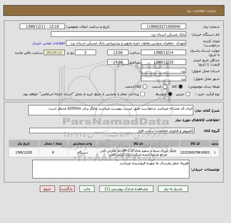 شرح کلی نیاز: ایران کد مشابه میباشد درخواست طبق لیست پیوست میباشد چاپگر برادر 6200dw مدنظر است