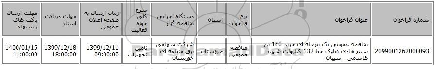 | 2099001262000093 | مناقصه عمومی یک مرحله ای خرید 180 تن سیم هادی هاوک خط 132 کیلوولت شهید هاشمی - شیبان | مناقصه عمومی | خوزستان | شرکت سهامی برق منطقه ای خوزستان | تامین تجهیزات | 1399/12/11 09:00:00 | 1399/12/18 18:00:00 | 1400/01/15 11:00:00 |