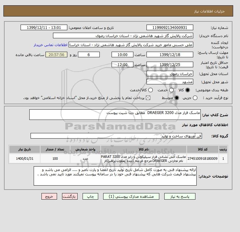 استعلام ماسک فرار مدل 3200 DRAEGER مطابق دیتا شیت پیوست, استعلام ماسک فرار مدل 3200 DRAEGER مطابق دیتا شیت پیوست
