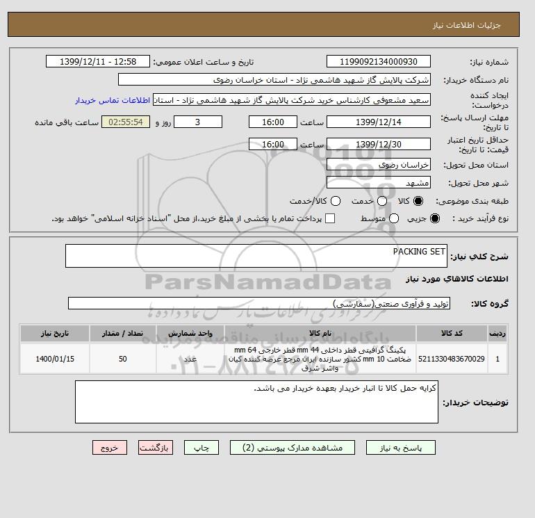 نام دستگاه خریدار:شرکت پالایش گاز شهید هاشمی نژاد - استان خراسان رضوی