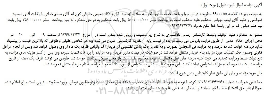 به موجب پرونده کلاسه 9900055 مطروحه دراین اجرا و با عنایت به صدور اجراییه صادره ازشعبه اول دادگاه عمومی حقوقی کرج له آقای مسلم خدائی با وکالت آقای مسعود ضرغامی و علیه آقای ایوب بهرامی محکوم علیه محکوم است به پرداخت مبلغ 500/000/000 ریال بابت محکوم به در حق محکوم له ونیز پرداخت مبلغ 25/000/000 ریال بابت نیم عشر دولتی که در این راستا خط تلفن همراه 09121642361