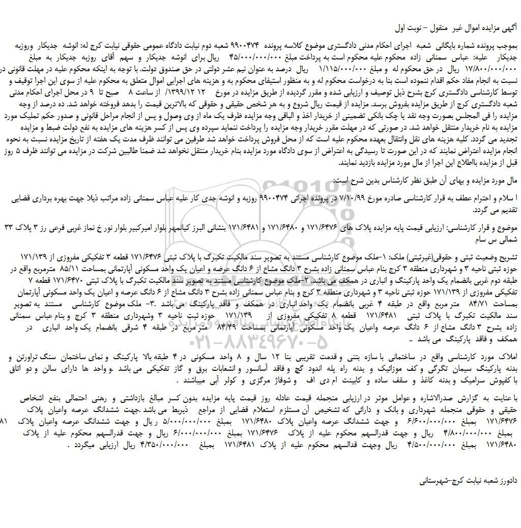 بموجب پرونده شماره بایگانی شعبه اجرای احکام مدنی دادگستری موضوع کلاسه پرونده 9900474 شعبه دوم نیابت دادگاه عمومی حقوقی نیابت کرج له: انوشه جدیکار وروزبه جدیکار علیه: عباس سمنانی زاده محکوم علیه محکوم است به پرداخت مبلغ 45/000/000/000 ریال برای انوشه جدیکار و سهم آقای روزبه جدیکار به مبلغ 17/800/000/000 ریال در حق محکوم له و مبلغ 1/115/000/000 ریال درصد به عنوان نیم عشر دولتی در حق صندوق دولت. با توجه به اینکه محکوم علیه در مهلت قانونی در مهلت مقرر نسبت به انجام مفاد حکم اقدام ننموده است بنا به درخواست محکوم له و به منظور استیفای محکوم به و هزینه های اجرایی اموال متعلق به محکوم علیه از سوی این اجرا توقیف و توسط کارشناسی دادگستری کرج بشرح ذیل توصیف و ارزیابی شده و مقرر گردیده از طریق مزایده در مورخ 12 1399/12/ از ساعت 8 صبح تا 9 در محل اجرای احکام مدنی شعبه دادگستری کرج از طریق مزایده بفروش برسد. مزایده از قیمت ریال شروع و به هر شخص حقیقی و حقوقی که بالاترین قیمت را بدهد فروخته خواهد شد. ده درصد از وجه مزایده را فی المجلس بصورت وجه نقد یا چک بانکی تضمینی از خریدار اخذ و الباقی وجه مزایده ظرف یک ماه از وی وصول و پس از انجام مراحل قانونی و صدور حکم تملیک مورد مزایده به نام خریدار منتقل خواهد شد. در صورتی که در مهلت مقرر خریدار وجه مزایده را پرداخت ننماید سپرده وی پس از کسر هزینه های مزایده به نفع دولت ضبط و مزایده تجدید می گردد. کلیه هزینه های نقل وانتقال بعهده محکوم علیه است که از محل فروش پرداخت خواهد شد طرفین می توانند ظرف مدت یک هفته از تاریخ مزایده نسبت به نحوه انجام مزایده اعتراض نمایند که در این صورت تا رسیدگی به اعتراض از سوی دادگاه مورد مزایده بنام خریدار منتقل نخواهد شد ضمنا طالبین شرکت در مزایده می توانند ظرف 5 روز قبل از مزایده بااطلاع این اجرا از مال مورد مزایده بازدید نمایند.
