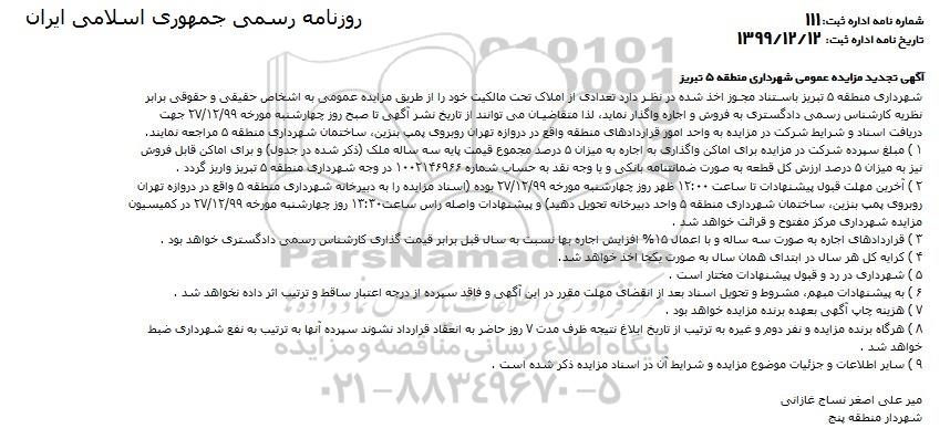 شهرداری منطقه 5 تبریز به استناد مجوز اخذ شده در نظر دارد تعدادی از املاک تحت مالکیت خود را از طریق مزایده عمومی به اشخاص حقوقی و حقیقی برابر نظریه کارشناس رسمی دادگستری به فروش و اجاره واگذار نماید. لذا متقاضیان می توانند از تاریخ نشر آگهی تا روز چهارشنبه مورخه 99.12.27 جهت دریافت اسناد و شرایط شرکت درمزایده به واحد امور قراردادهای منطقه واقع در دروازه تهران روبروی پمپ بنزین ساختمان شهرداری منطقه 5 طبقه دوم مراجعه نمایند