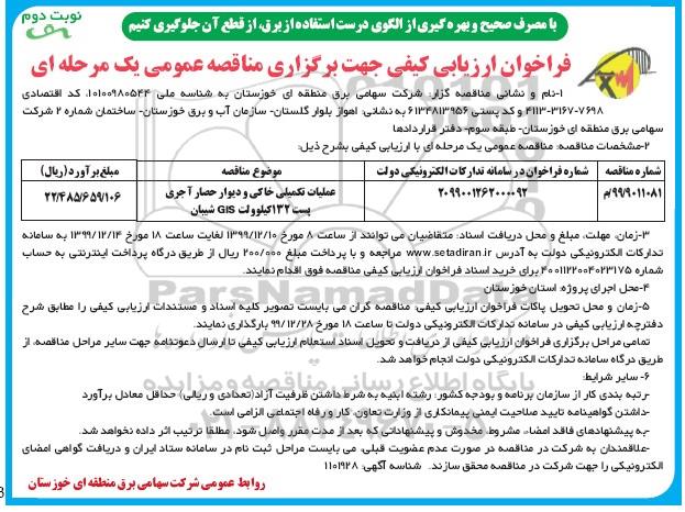 مناقصه عملیات تکمیلی خاکی و دیوار حصار آجری پست 132 کیلوولت GIS نوبت دوم از کلیه افراد متخصص و شرکتها واجد شرایط دعوت به عمل میآید در مناقصه با کد خبرگزاری پارس نماد: 3235770 شرکت نمایند.
