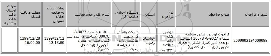 مناقصه، فراخوان ارزیابی کیفی مناقصه شماره 9027-8- 30078 (ساخت دو عدد شیر کنترل فشار به همراه اکچیوتر (تولید داخل کشور)), فراخوان ارزیابی کیفی مناقصه شماره 9027-8- 30078 (ساخت دو عدد شیر کنترل فشار به همراه اکچیوتر (تولید داخل کشور))
