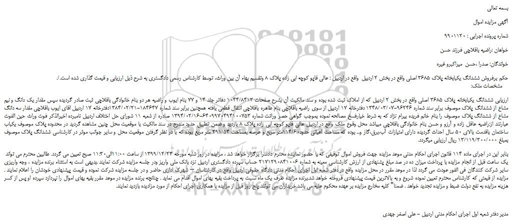 ارزیابی ششدانگ یکبابخانه پلاک 3685 اصلی واقع در بخش 2 اردبیل که از املاک ثبت شده بوده و سند مالکیت آن بشرح صفحات 1044/8413 دفاتر جلد 14 و 77 بنام ایوب و راضیه هر دو بنام خانوادگی باقلاچی ثبت صادر گردیده سپس مقدار یک دانگ و نیم مشاع از ششدانگ پلاک موصوف برابر سند شماره 96246-1348/03/07 دفترخانه 17 اردبیل از سوی راضیه باقلاچی بنام طاهره باقلاچی انتقال قطعی یافته همچنین برابر سند شماره 184647-1384/02/21دفترخانه 17 اردبیل اقای ایوب باقلاچی مقدار سه دانگ مشاع از ششدانگ پلاک موصوف را بنام خانم فریده بیرام نژاد که به شرط خیارفسخ مصالحه نموده بموجب گواهی حصر وراثت شماره 6409970494100753-1394/02/16 صادره از شعبه 11 شورای حل اختلاف اردبیل نامبرده اخیرالذکر فوت وراث حین الفوت عبارتند از:راضیه عاقل زاده و آرزو و حسن بنام خانوادگی باقلاچی میباشد محل وقوع ملک واقع در اردبیل عالی قاپو کوچه ابی زاده پلاک 8 بازدید و ضمن تطبیق حدود مندرج در سند مالکیت با موقعیت محل چنین مشاهده گردید در محدوده پلاک موصوف یکباب ساختمان باقدمت بالای 50 سال احداث گردیده دارای امتیازات آب،برق،گاز و... بوده که مساحت اعیانی حدود114/60متر مربع و عرصه بمساحت 291/54 متر مربع بوده که با در نظر گرفتن موقعیت محل و سایر جوانب موثر در کارشناسی ششدانگ پلاک موصوف بمبلغ 13/119/300/000 ریال ارزیابی میگردد.