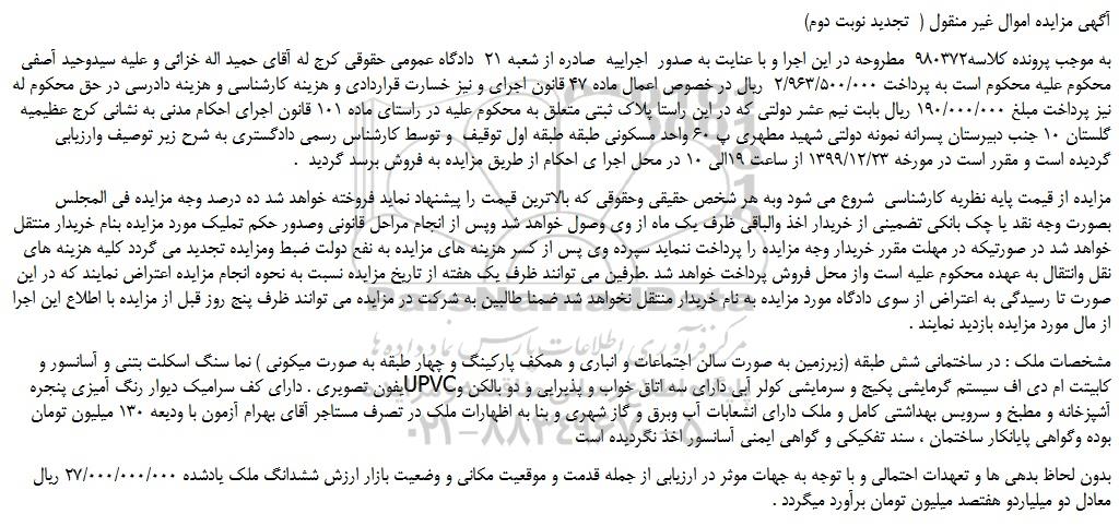 به موجب پرونده کلاسه980372  مطروحه در این اجرا و با عنایت به صدور  اجراییه  صادره از شعبه 21  دادگاه عمومی حقوقی کرج له آقای حمید اله خزائی و علیه سیدوحید آصفی محکوم علیه محکوم است به پرداخت 2/963/500/000  ریال در خصوص اعمال ماده 47 قانون اجرای و نیز خسارت قراردادی و هزینه کارشناسی و هزینه دادرسی در حق محکوم له نیز پرداخت مبلغ 190/000/000 ریال بابت نیم عشر دولتی که در این راستا پلاک ثبتی متعلق به محکوم علیه در راستای ماده 101 قانون اجرای احکام مدنی به نشانی کرج عظیمیه گلستان 10 جنب دبیرستان پسرانه نمونه دولتی شهید مطهری پ 60 واحد مسکونی طبقه طبقه اول توقیف  و توسط کارشناس رسمی دادگستری به شرح زیر توصیف وارزیابی گردیده است و مقرر است در مورخه 1399/12/23 از ساعت 19الی 10 در محل اجرا ی احکام از طریق مزایده به فروش برسد گردید  .