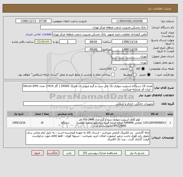 شرح کلی نیاز: تعداد 10 دستگاه اسپلیت دیواری تک پانل سرد و گرم اینورتر تک التریک 24000 ( گاز r410) -مدل bts-un-24hr - ایران کد مشابه میباشد -