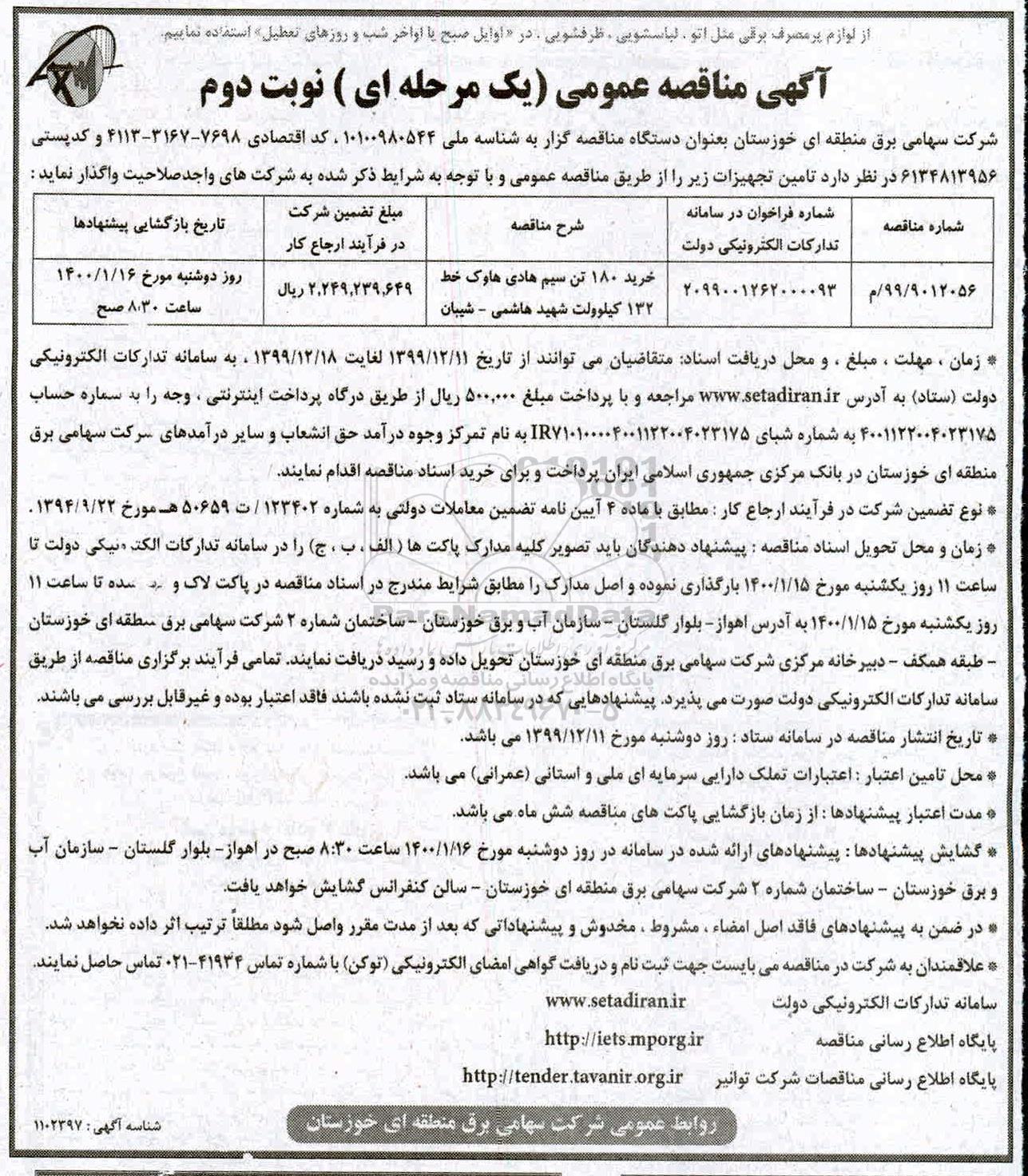 | 9012056/ 99/ م | 2099001262000093 | خرید 180 تن سیم هادی هاوک خط 132 کیلوولت شهید هاشمی - شیبان | 2.249.239.649 ریال | روز دوشنبه مورخ 1400.1.16 ساعت 8.30 صبح |