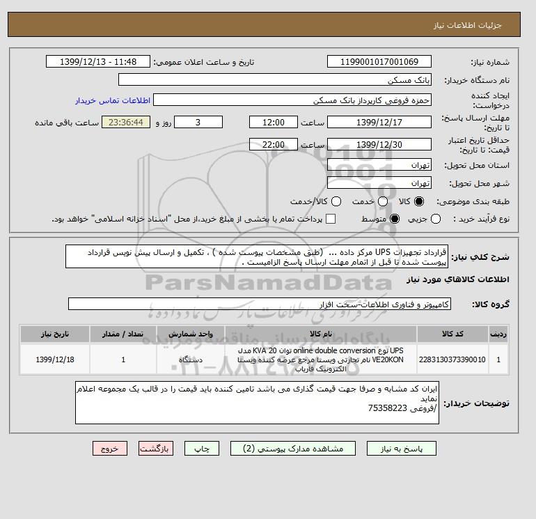 شرح کلی نیاز: قرارداد تجهیزات UPS مرکز داده ... (طبق مشخصات پیوست شده ) ، تکمیل و ارسال پیش نویس قرارداد پیوست شده تا قبل از اتمام مهلت ارسال پاسخ الزامیست .