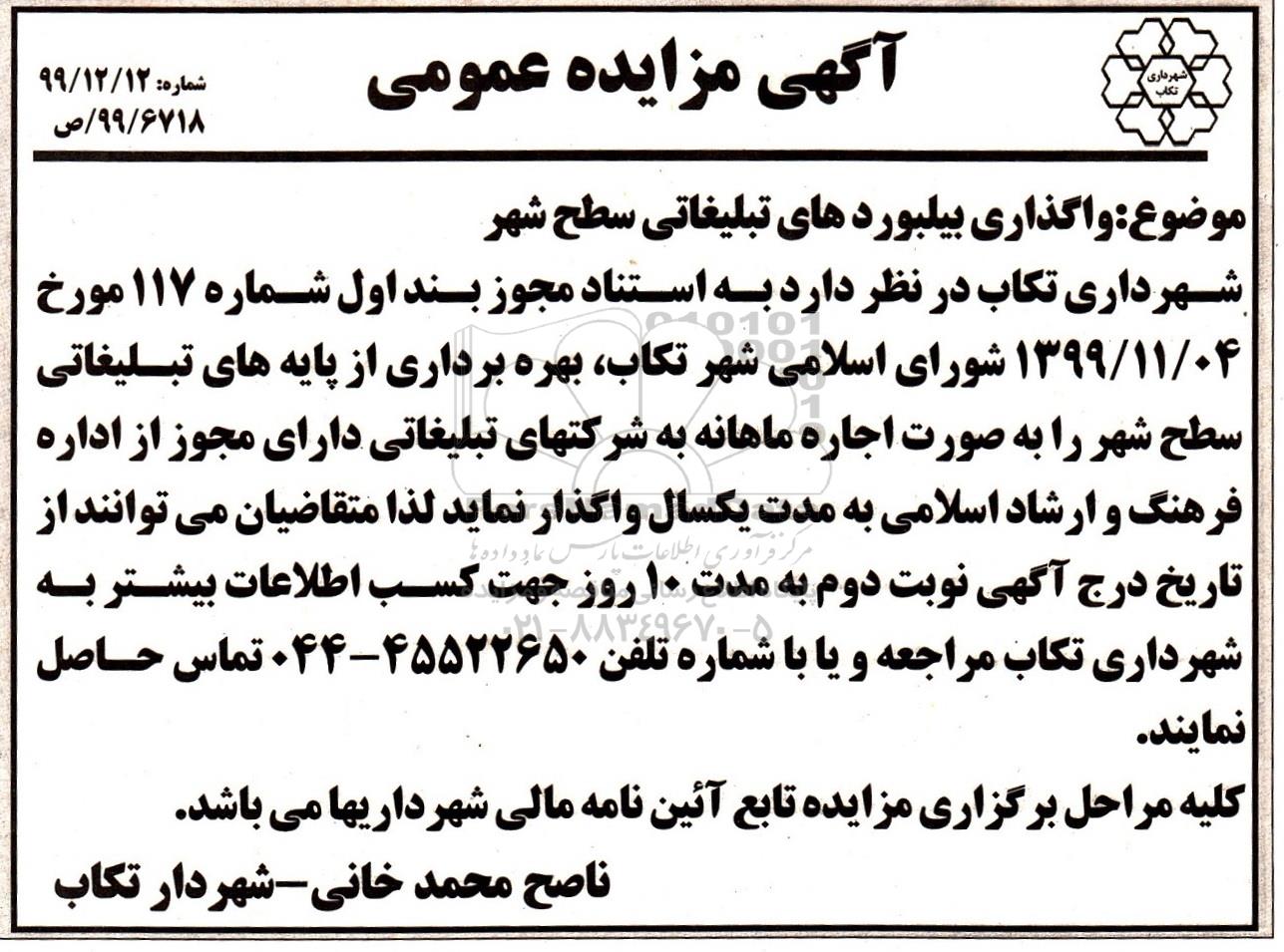 شهرداری تکاب در نظر دارد بهره برداری از پایه های تبلیغاتی سطح شهر را به صورت اجاره ماهانه به شرکت های تبلیغاتی دارای مجوز از اداره فرهنگ و ارشاد اسلامی به مدت یک سال واگذار نماید لذا متقاضیان می توانند از تاریخ درج آگهی نوبت دوم به مدت ۱۰ روز جهت کسب اطلاعات بیشتر به شهرداری تکاب مراجعه و یا با شماره تلفن 45522650-044 تماس حاصل نمایند .